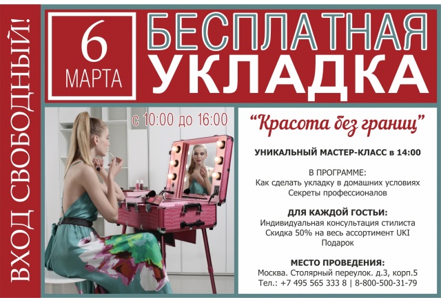 Приглашаем на уникальный мастер-класс в преддверии Международного женского дня! 6 марта с 10:00 до 16:00 нашим дорогим гостьям в подарок бесплатная укладка! В 14:00 - мастер-класс от профессионального стилиста Maletti. В программе: Укладка в домашних условиях быстро и легко, Секреты и трюки от профессионалов. Для каждой гостьи: Индивидуальная консультация стилиста и подарок!