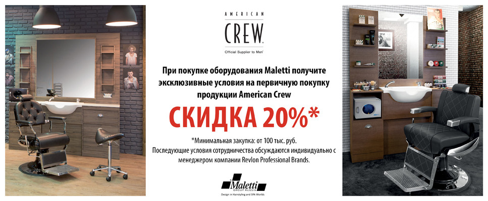 При покупке оборудования Maletti получите эксклюзивные условия на первичную покупку продукции Revlon Professional, American Crew, Orofluido & Intragen